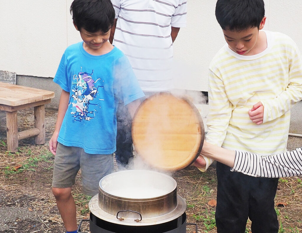 - 「ぬか釜」と呼ばれる昔ながらの炊飯器具で片野尾のおいしい棚田米を皆さんで炊いていただきます。
