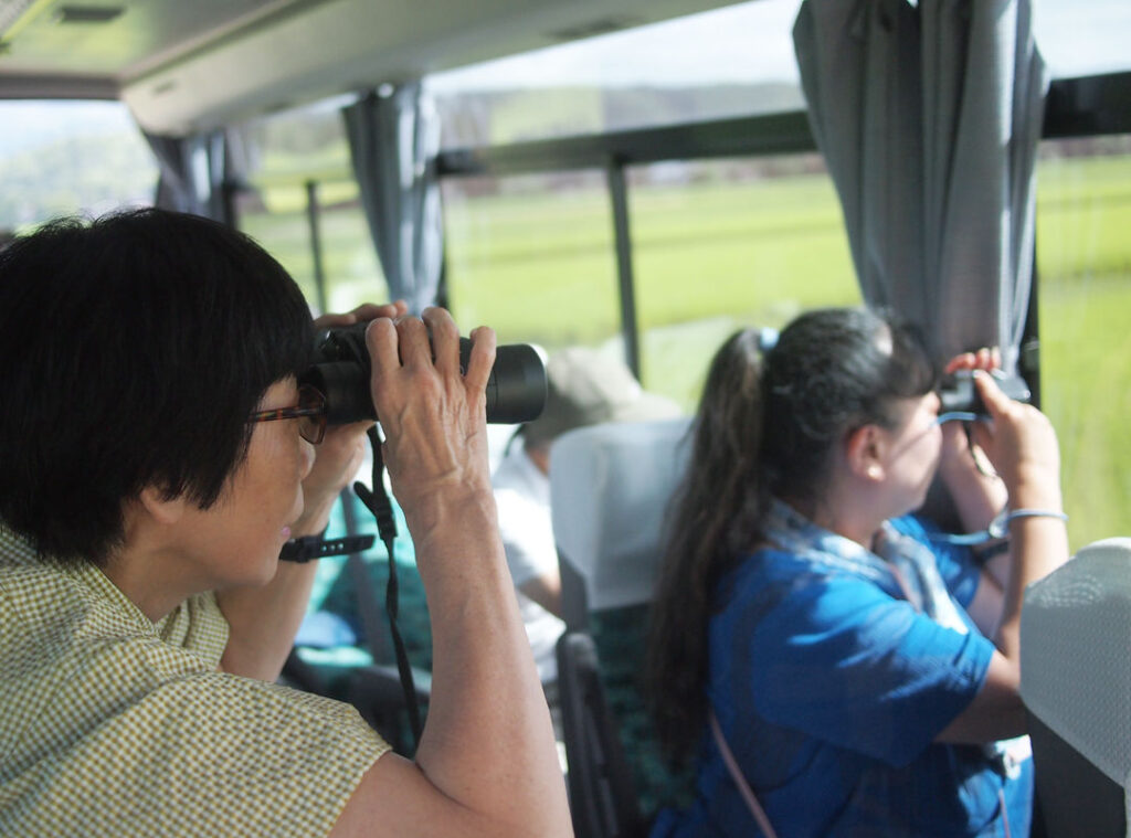 - どこまでも続く島の広大な田んぼの風景の中をバスで走ります。トキを見つけたら車内から双眼鏡で観察してみましょう。